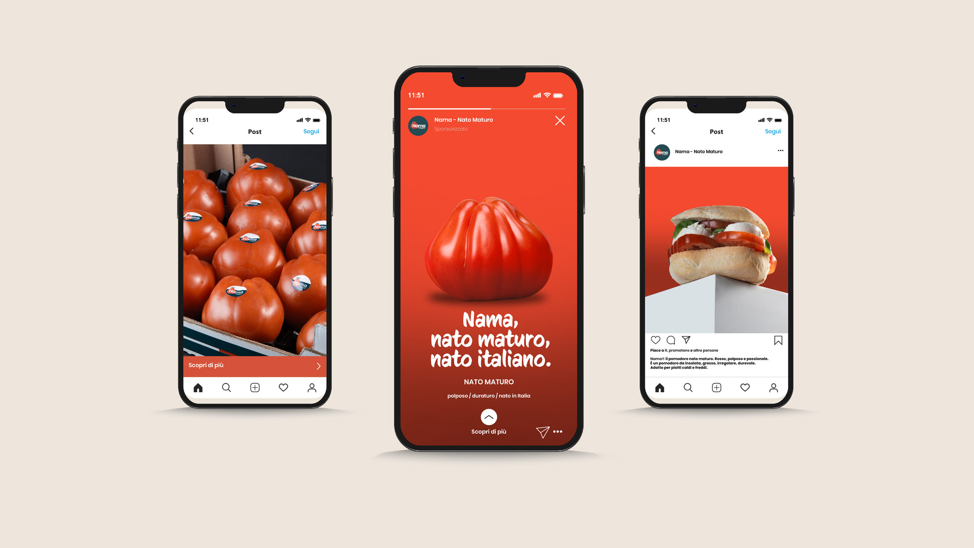 Abbiamo sviluppato una headline incisiva che sintetizzasse perfettamente il messaggio del brand: “NAMA. Nato maturo, nato italiano”. Questa frase non solo richiama l’attenzione, ma racchiude anche l’essenza di NAMA un prodotto che porta con sé il sapore autentico della tradizione italiana.