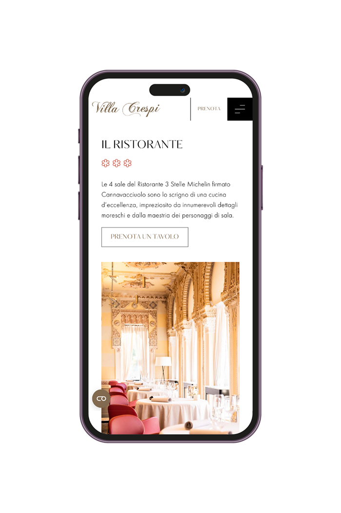La realizzazione del sito web di Villa Crespi è stata focalizzata sull’esperienza digitale, progettata per essere intuitiva e chiara. L’eleganza del design del sito rispecchia l’architettura e la raffinatezza della dimora, offrendo una visione che si riflette al mondo di Villa Crespi. Ogni elemento è stato attentamente pensato per coinvolgere l’utente, dalla presentazione delle suite al percorso gastronomico curato dallo chef Antonino Cannavacciuolo. È stato anche facilitato il percorso di prenotazione del sito, invitando gli ospiti a immergersi nell’esclusiva atmosfera del Lago d’Orta.